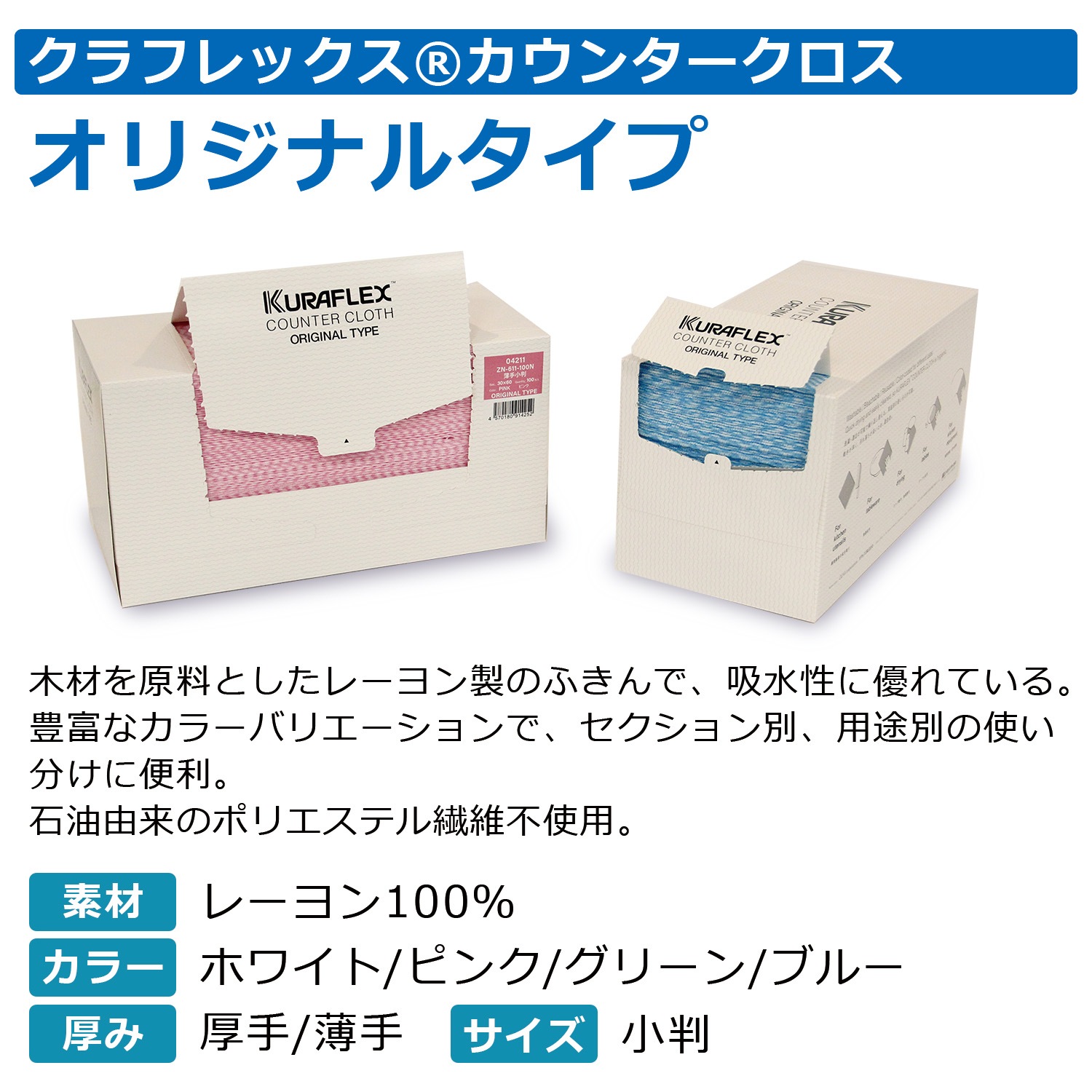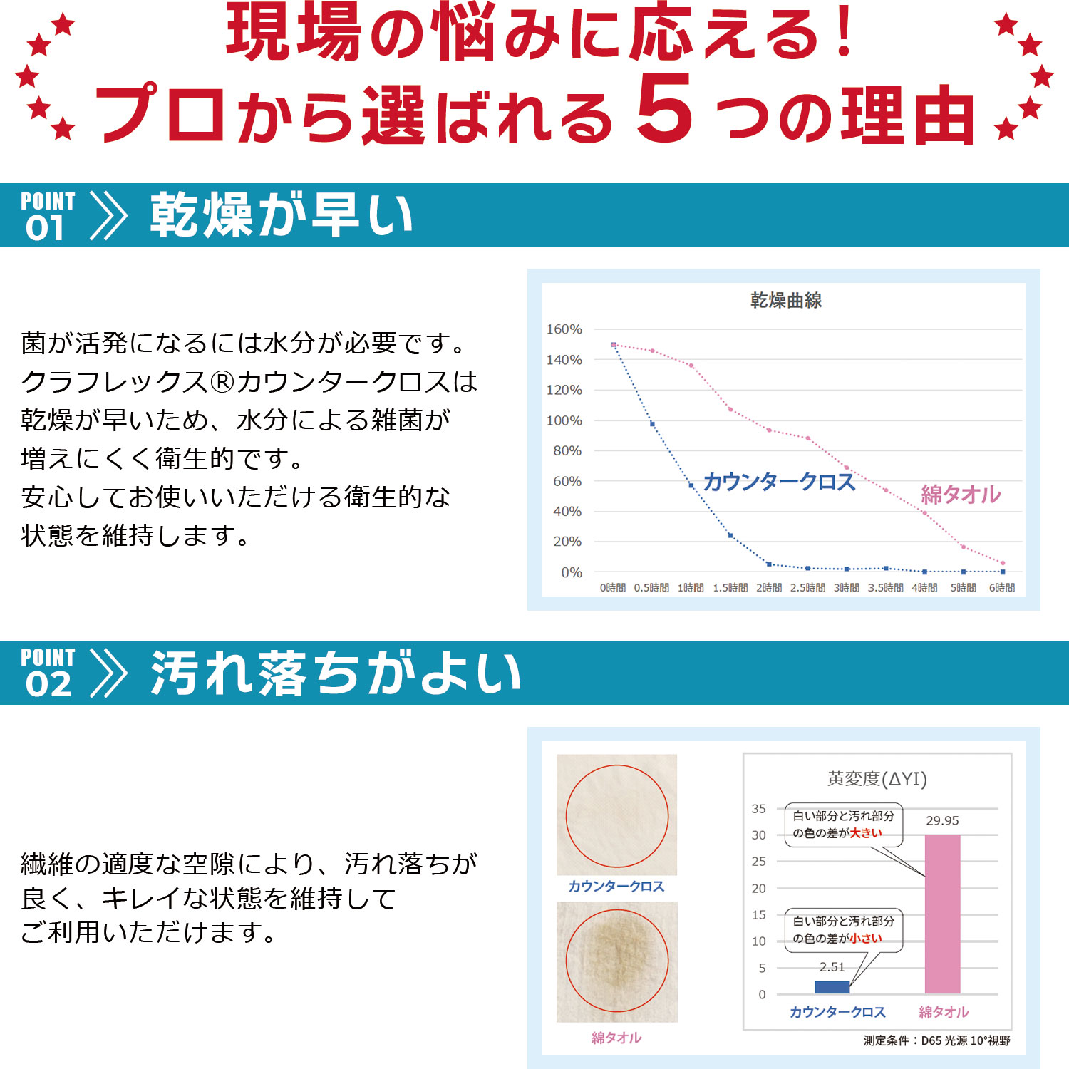 50年以上も飲食店や食品工場、医療現場など、あらゆるプロの現場で「クラフレックスカウンタークロス」が選ばれる理由は、雑菌が繁殖しにくく衛生的な状態を保ち、繰り返し使えるからです。汚れが落ちやすく高い吸水性を持ちながらも、乾燥が早いので雑菌が繁殖しにくく衛生管理を求められる現場で、ふきんやダスター管理の悩みを解決する製品です。