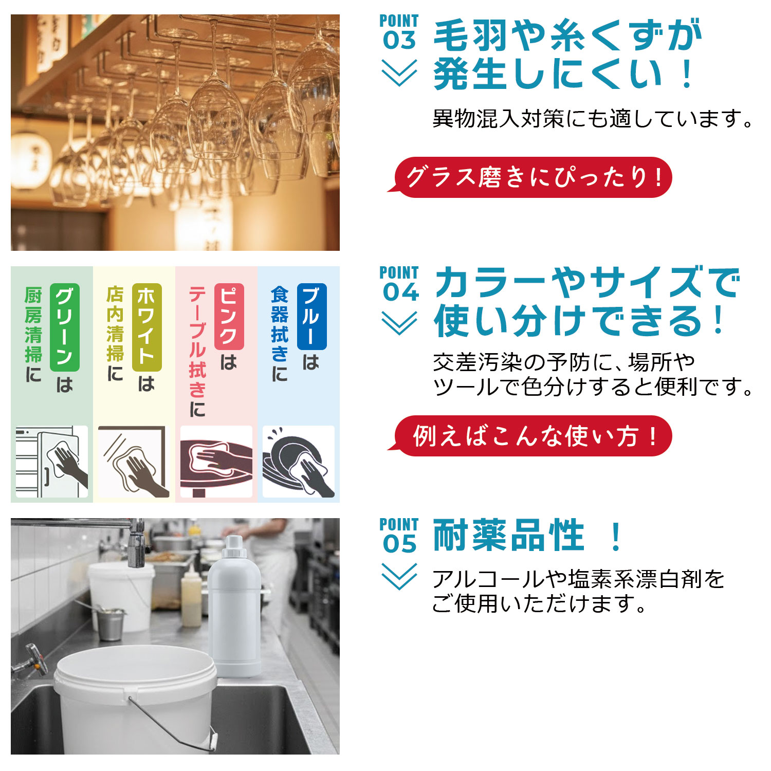 素材は洗濯しても毛羽や糸くずが発生しにくい上に、厚みや大きさには様々なバリエーションがあり、テーブル拭きはもちろん、食器拭きや調理用ふきんなど幅広くご使用いただけます。厨房、サニタリー、レジ周り、フロア、カウンター、バックヤードなど、様々な場所で活躍。多彩なカラーをご用意し、場所や用途で色を分けすることで、交差汚染のリスクを低減し、より徹底した衛生管理が可能になります。