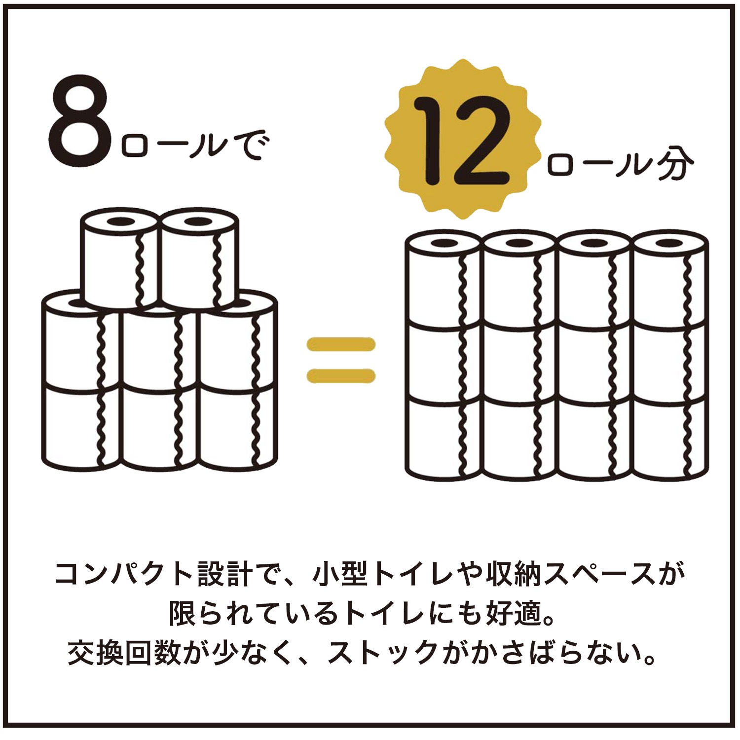 1袋(8ロール)で通常品12ロール分の長さ(1.5倍巻き)があるため、少ないストック数でも長持ちします。