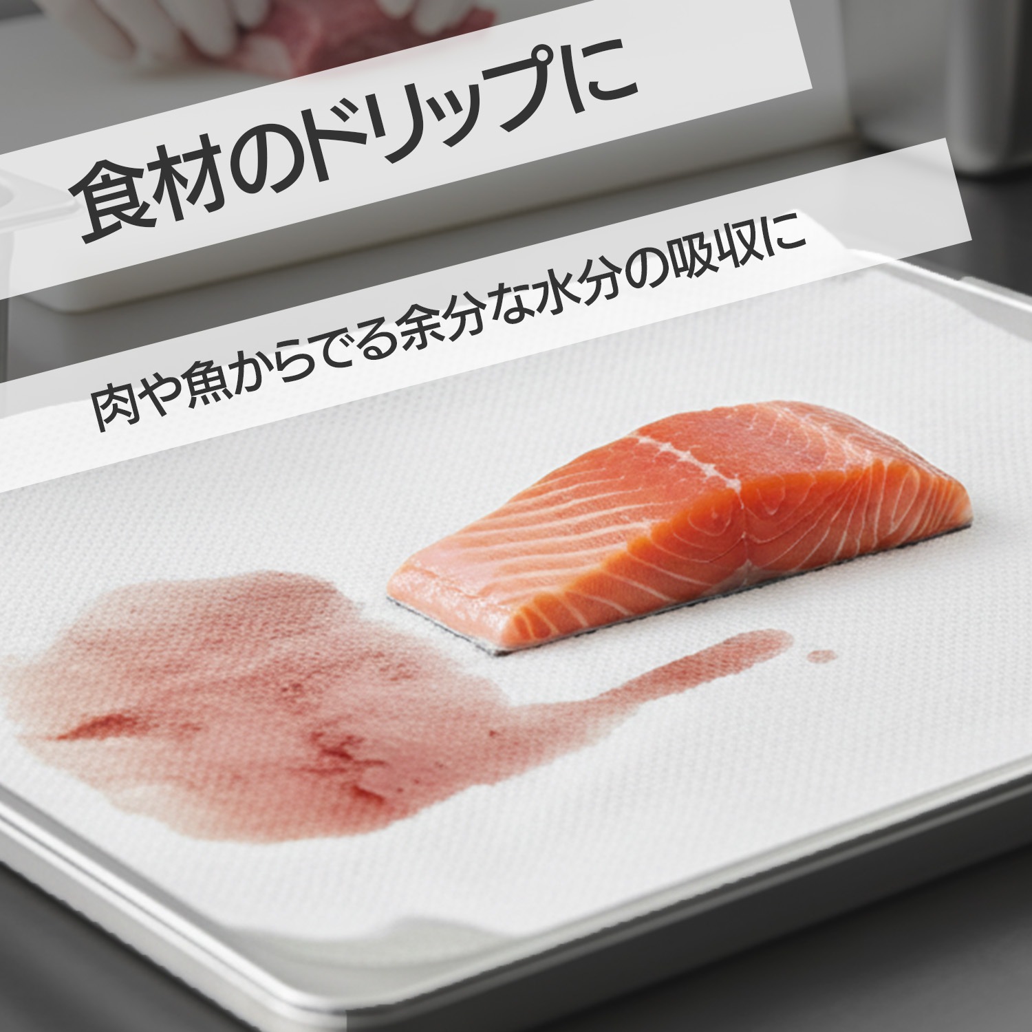 - ・食材のドリップ吸収: 肉や魚から出る余分な水分の吸収(下敷き)にもお使いいただけます。