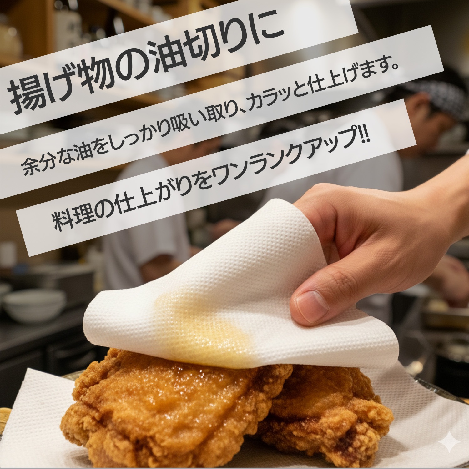 1. 「吸水性・吸油性」 天然パルプを使用した厚手でソフトなフェルトタッチのシートが 水分や油分をしっかり吸収します。- ・揚げ物の油切り: 余分な油を吸い取り、カラッとした仕上がりをサポートします。