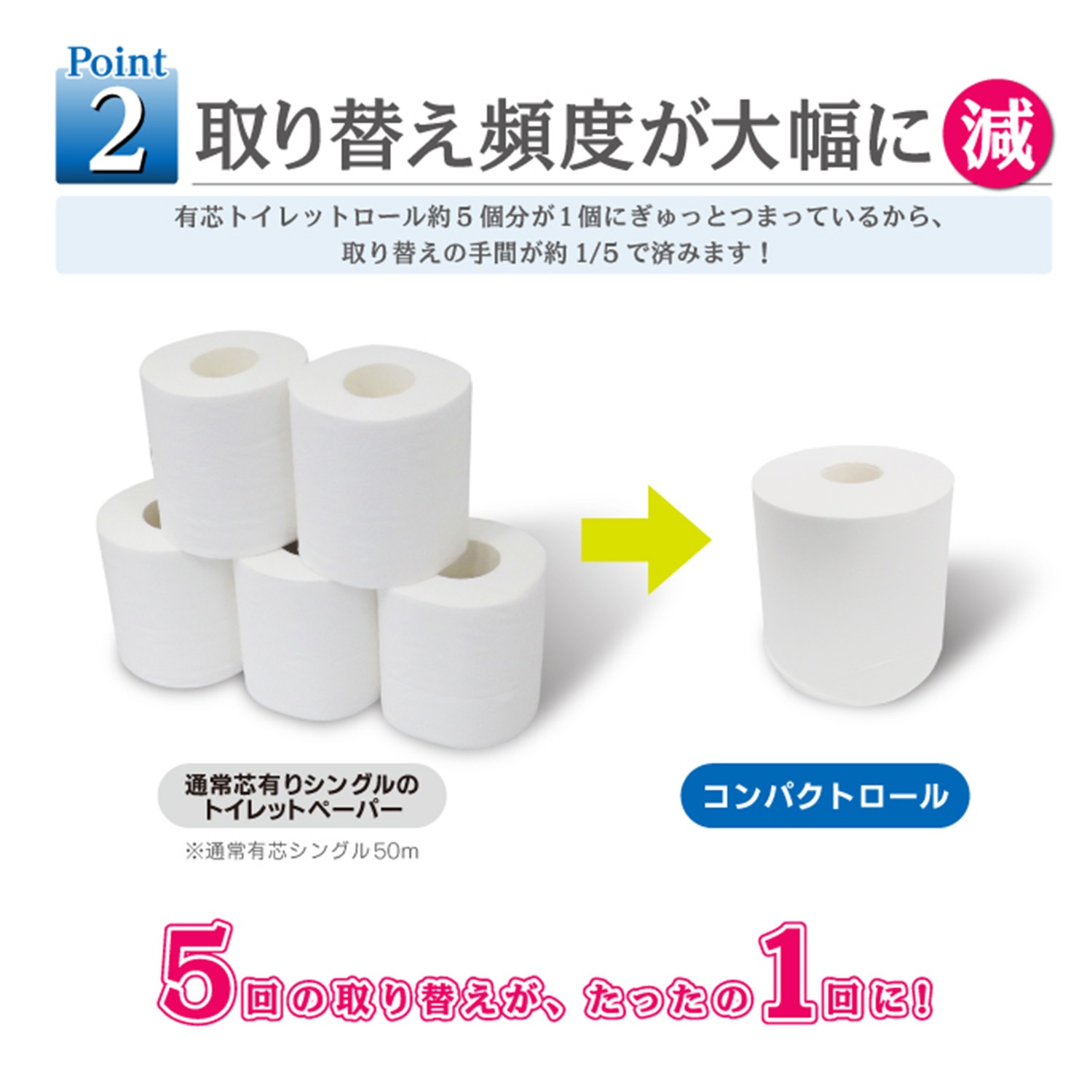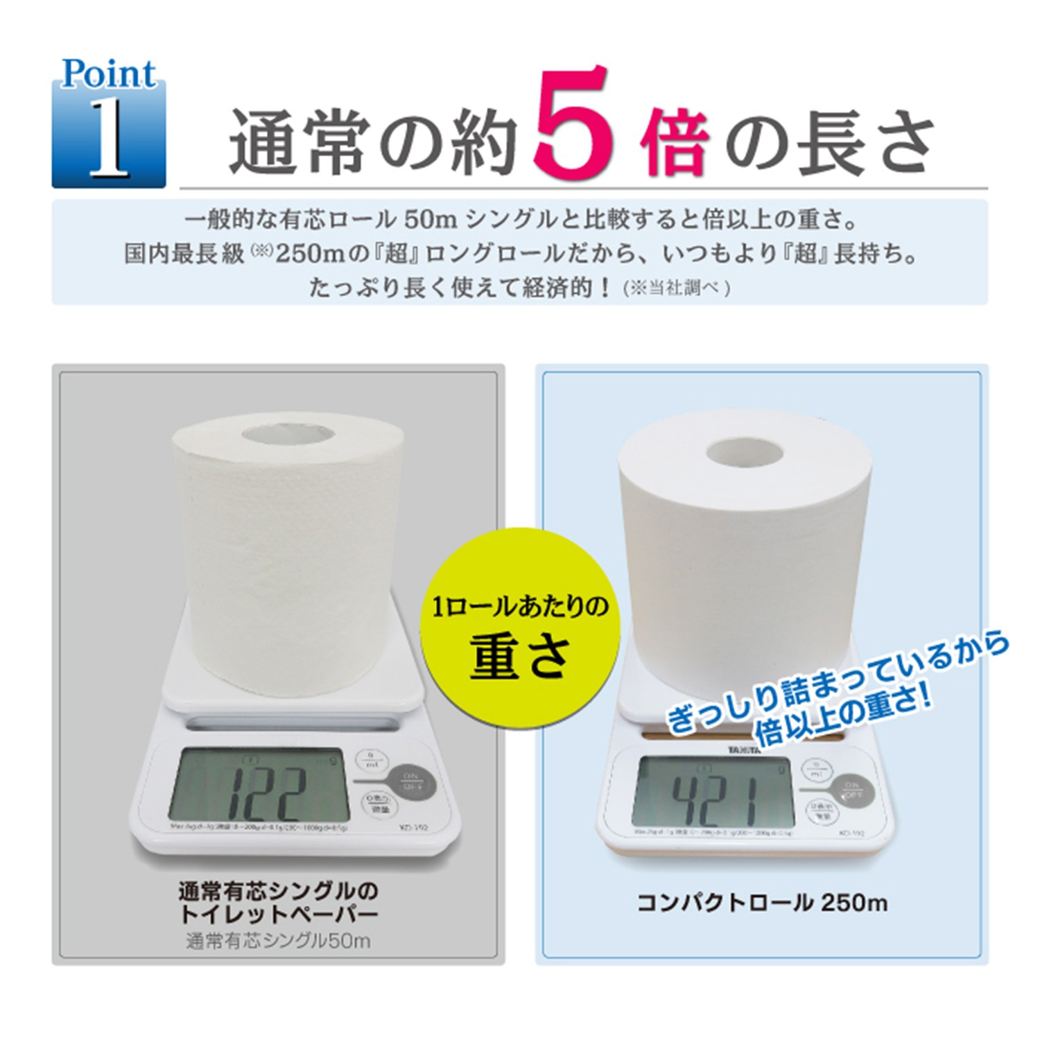 - 省スペース: ロール数が大幅に減るため、ストックの収納スペースが約1/5にコンパクト化。買い置きのまとめ買いも場所を取りません。