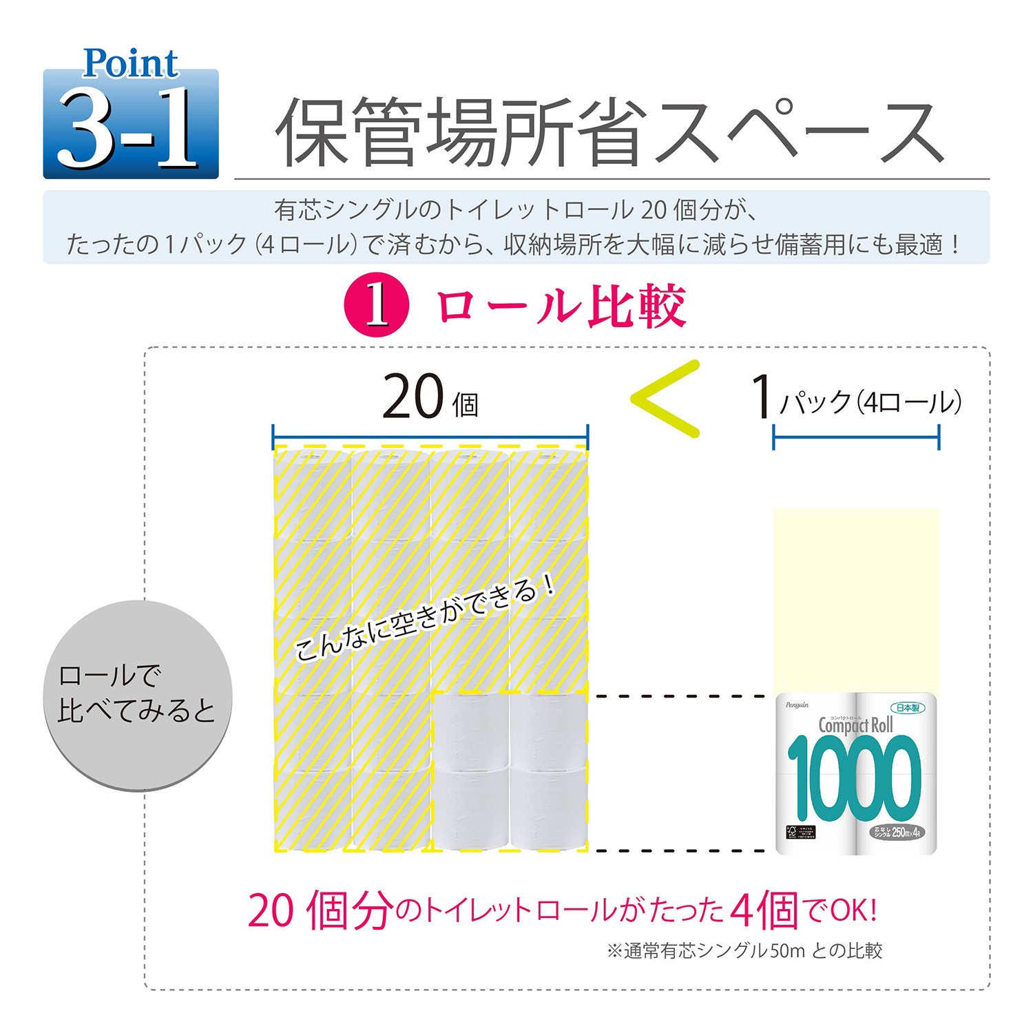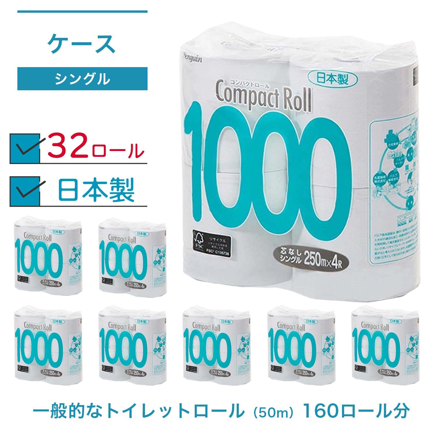 「コンパクトロール1000 4R シングル」は、通常のシングルロール(約50m)と比較して5倍の長さ、250mを実現しました。ご家庭やビジネスの現場で発生する「非効率」を根本から見直すために設計された、コストダウンと快適性のための業務用・家庭用消耗品です。