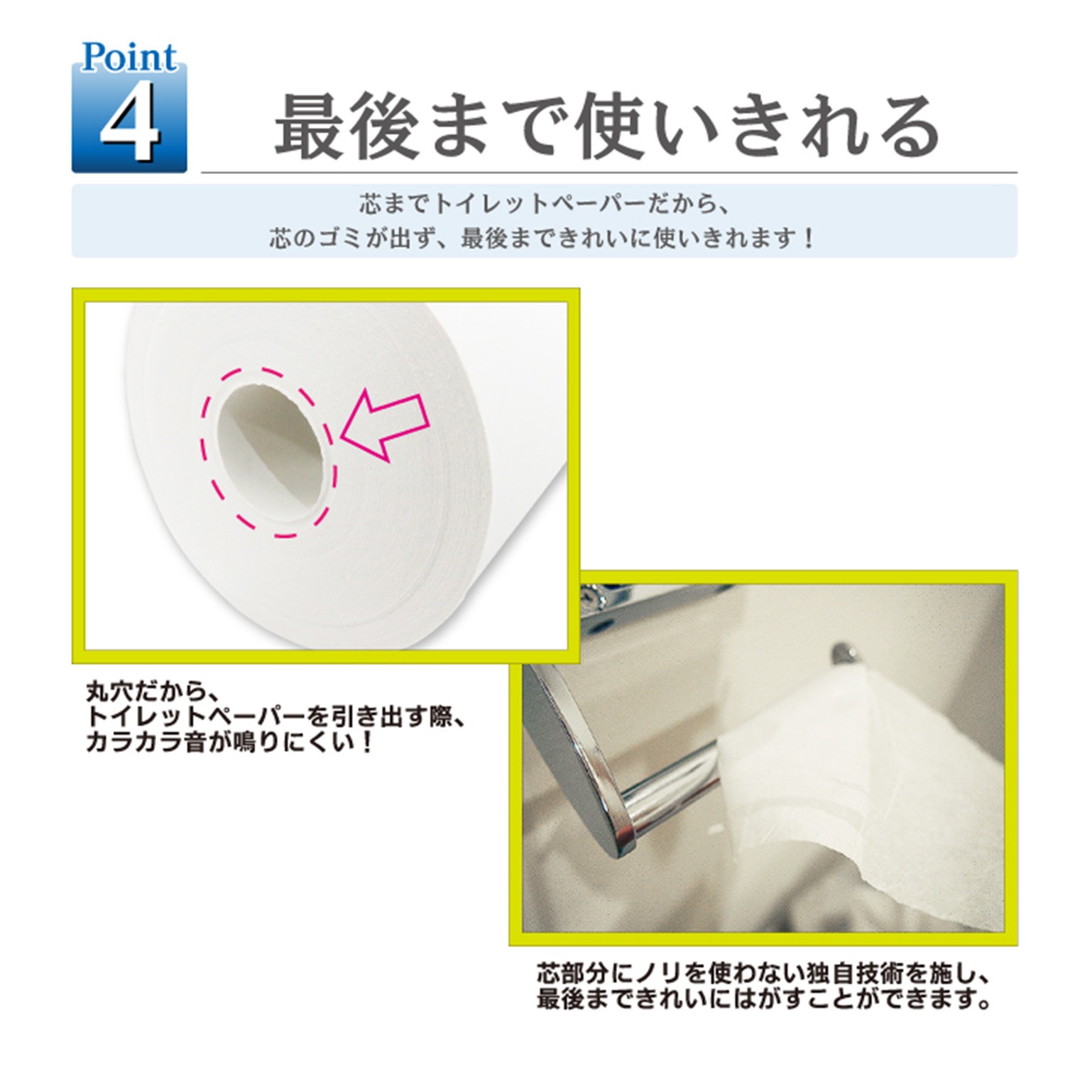 芯なし設計はロールの最後まで無駄なく使い切れるエコ仕様であり、環境負荷の低減に貢献します。