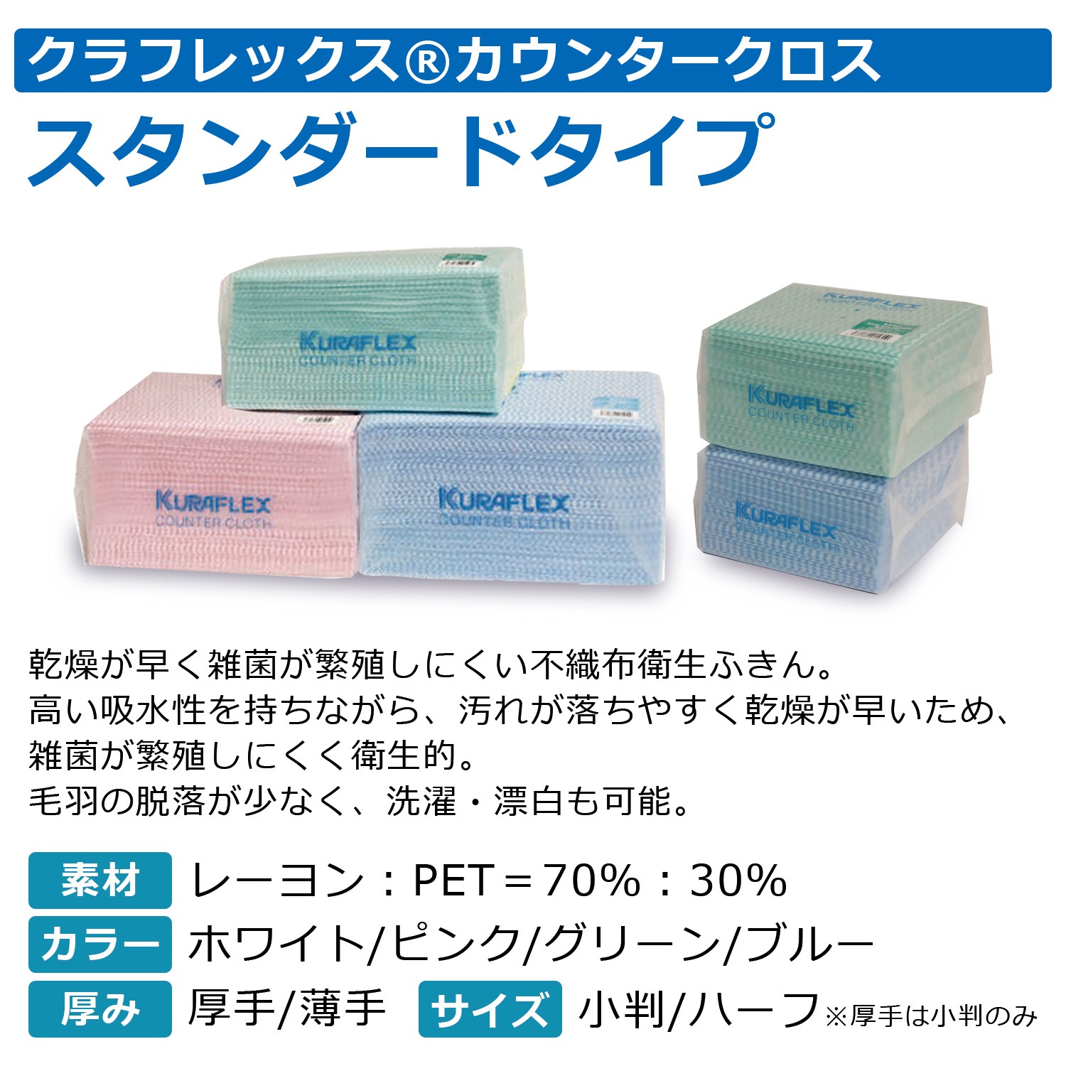 50年以上も飲食店や食品工場、医療現場など、あらゆるプロの現場で「クラフレックス・カウンタークロス」が選ばれる理由は、雑菌が繁殖しにくく衛生的な状態を保ち、繰り返し使えるからです。汚れが落ちやすく高い吸水性を持ちながらも、乾燥が早いので雑菌が繁殖しにくく衛生管理を求められる現場で、ふきんやダスター管理の悩みを解決する製品です。